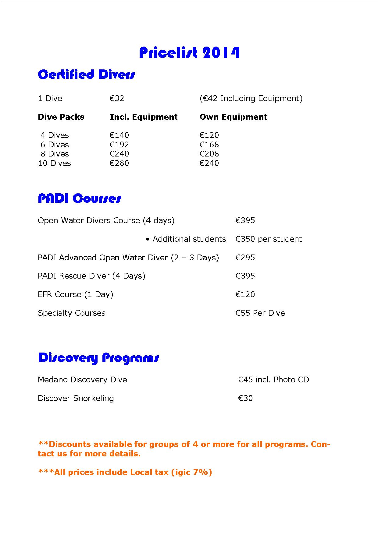 Tenerife Scuba Diving Price List 2014